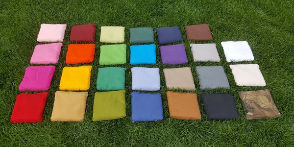 Our standard bags are your traditional cornhole bags. These bags are perfect for playing in your backyard or while tailgating. Each bag is made with high quality duck cloth/duck canvas and weighed with a digital scale to 16 ounces (1 pound) for consistent weight. They are available with two different fills: whole corn or plastic pellets.